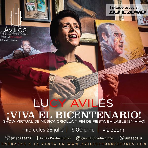 SHOW VIRTUAL DE MÚSICA CRIOLLA POR FIESTAS PATRIAS ¡EN VIVO! A CARGO DE LA MEJOR: LUCY AVILÉS. ¡VALSES, MARINERAS, Y MUCHO MÁS! ADEMÁS, FIN DE FIESTA BAILABLE CON EL GRAN DJ CANO QUE NOS HARÁ GOZAR CON SUS MEJORES MEZCLAS PERUANAS. DISFRUTAREMOS DE UNA NOCHE MÁGICA LLENA DE CANTO, BAILE, HISTORIAS Y PREMIOS. ¡LOS ESPERAMOS!
